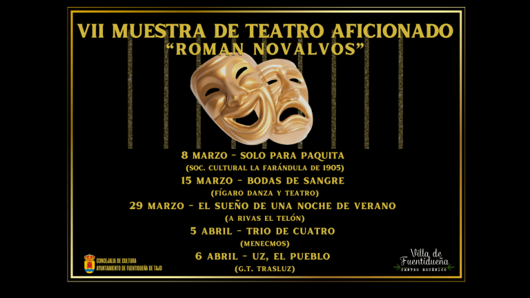 El Ayuntamiento de Fuentidueña ha puesto a la venta los abonos para la VII Muestra de Teatro “Román Novalvos”, que se celebrará próximamente. Los abonos, que incluyen las seis funciones programadas, estarán disponibles del 3 al 7 de marzo en el propio Ayuntamiento, con un precio de 18 euros y la posibilidad de elegir butaca.