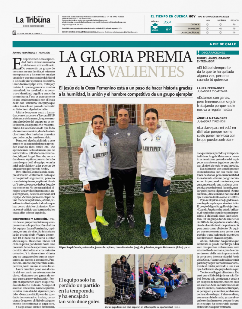 La futbolista de Fuentidueña de Tajo Ángela Matamoros aparece como una de las jugadoras destacadas en un reportaje publicado por el periodista Álvaro Fernández en La Tribuna de Cuenca, centrado en la temporada del Jesús de la Ossa Femenino.