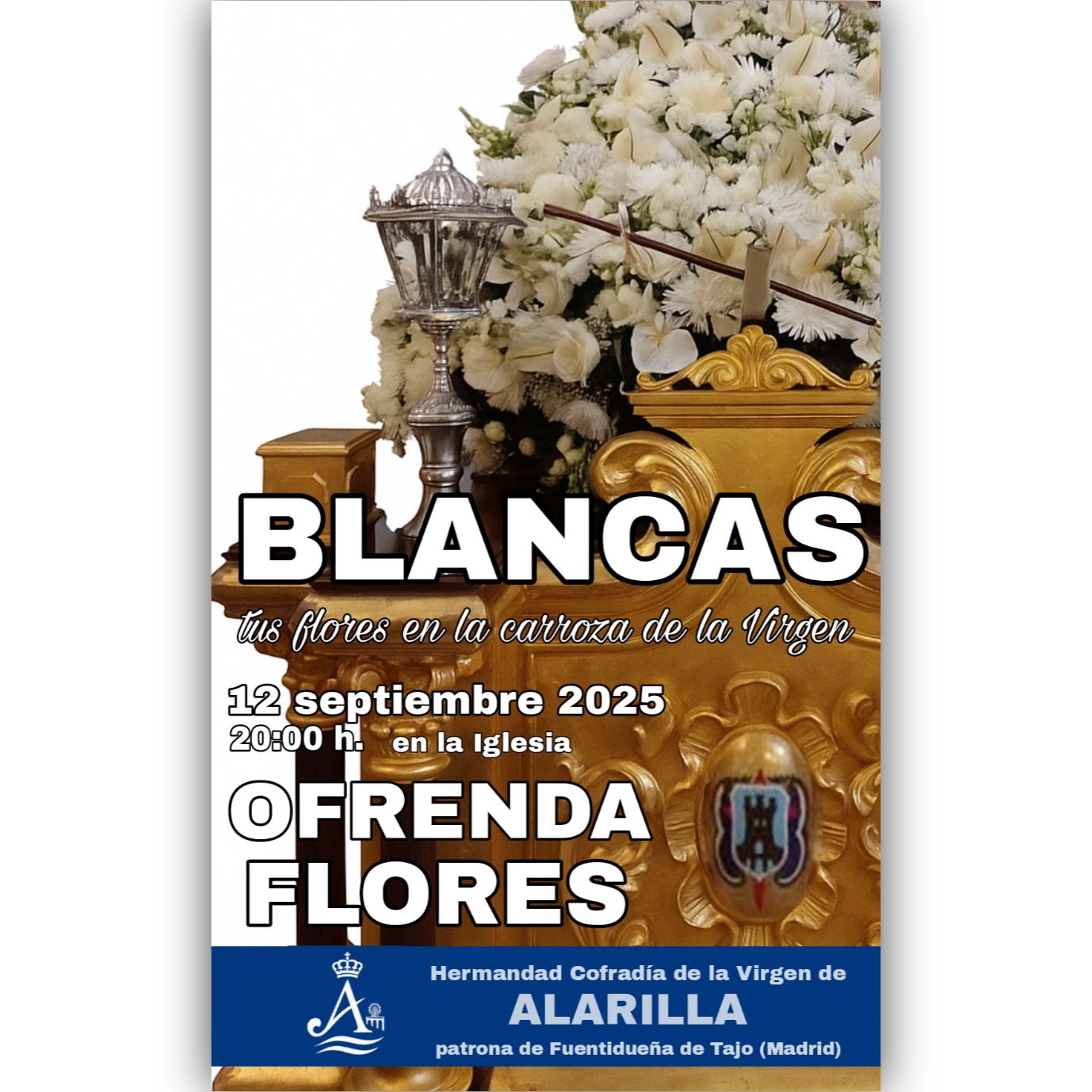 La Hermandad Cofradía de la Virgen de Alarilla, patrona de Fuentidueña de Tajo, ha anunciado la celebración de la tradicional Ofrenda de Flores en honor a la Virgen el próximo 12 de septiembre de 2025 a las 20:00 horas en la Iglesia parroquial. Bajo el lema “Blancas, tus flores en la carroza de la Virgen”, …