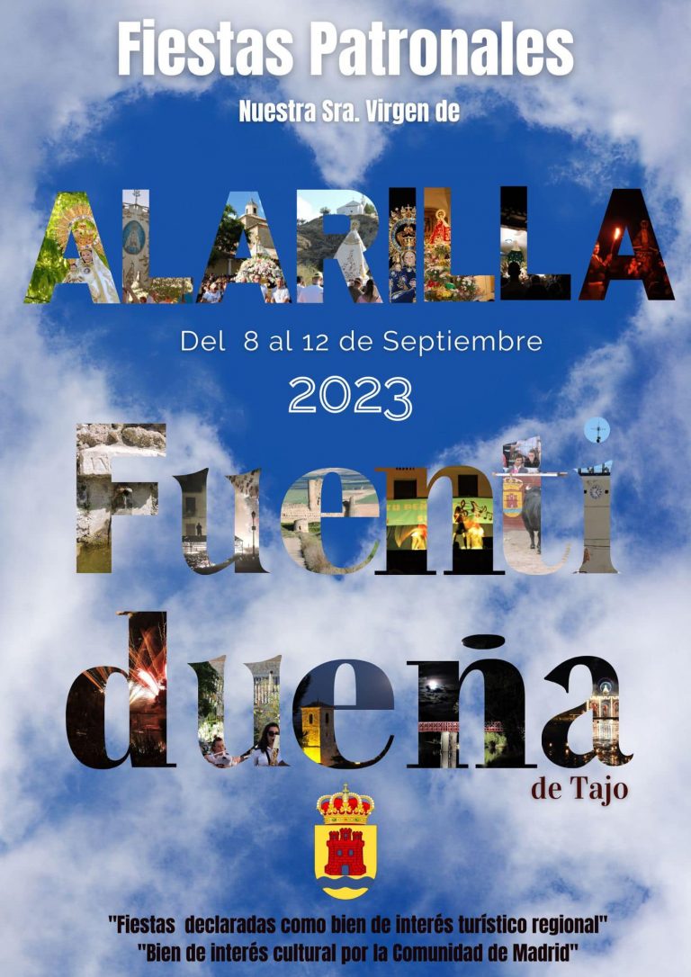 la tipografia de Alarilla y Fuentidueña son las protagonistas de este cartel ante un corazon dentro de nubes. En cada una de las letras podemos ver momentos importantes de nuestras fiestas donde la Virgen es la protanista. La palabra Fuentidueña contiene monumentos de la localidad asi como alusiones a espectaculos y a la Embarcación