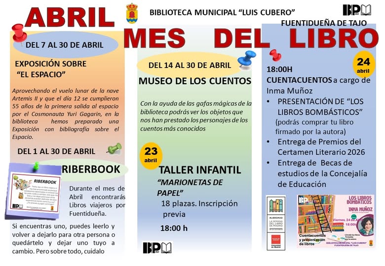 La Biblioteca Municipal “Luis Cubero” de Fuentidueña de Tajo ha preparado una completa programación cultural con motivo del Mes del Libro, que se desarrollará a lo largo de todo el mes de abril y que incluye actividades para todas las edades.