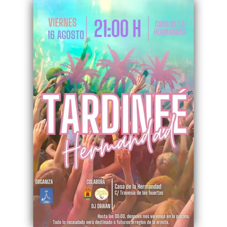 La cita es el viernes 16 de agosto a partir de las 21:00 horas en la Casa de la Hermandad, ubicada en la Calle Travesía de las Huertas. La noche contará con la musica de DJ Draian, quien pinchará hasta la medianoche. Después, la fiesta continuará en la piscina.