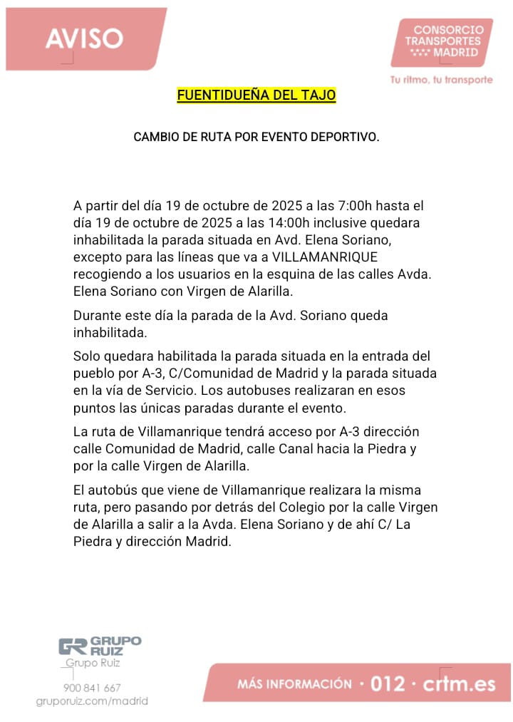Con motivo de este evento deportivo, el Consorcio Regional de Transportes de Madrid ha informado de un cambio temporal en la ruta de autobuses que afecta a Fuentidueña de Tajo durante la mañana del domingo.