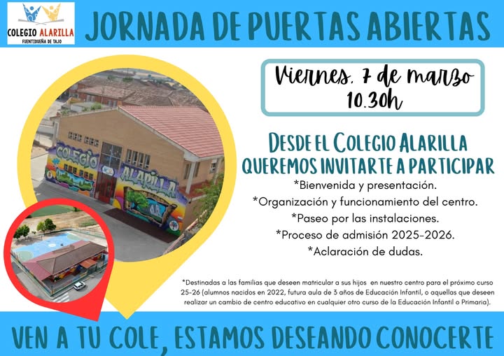 El próximo 7 de marzo, a las 10:30 de la mañana, el CEIP Alarilla organizará una jornada de puertas abiertas para que las familias puedan conocer el centro y sus instalaciones.