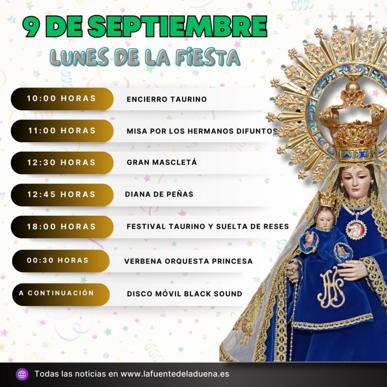 Este Lunes de la fiesta llega con el encierro, la Misa de Difuntos por la mañana y la mascletá. Por la tarde segunda jornada taurina antes de la verbena y disco movil.
