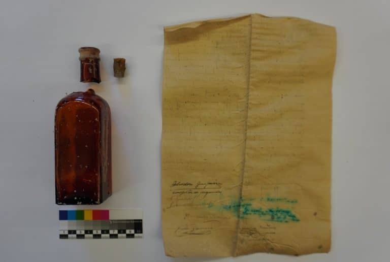 Fue en estos trabajos donde apareció esa botella de cristal, de un popular jarabe llamado Ceregumil, y en su interior había un papel enrollado. La botella se trasladó al Palacio Arzobispal de Alcalá de Henares y un arqueólogo la limpió y de ella extrajo el documento.