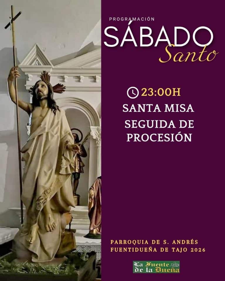 Horarios religiosos Sábado Santo Fuentidueña de Tajo Horarios religiosos de Sábado Santo 2026 de la Parroquia de San Andrés de Fuentidueña de Tajo Vistas 263