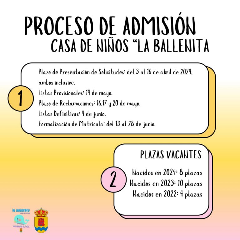 En cuanto a las plazas disponibles, se ha especificado que habrá 8 vacantes para niños nacidos en 2024, 10 vacantes para aquellos nacidos en 2023, y 4 plazas para los nacidos en 2022. Este proceso de admisión refleja el compromiso de «La Ballenita» con la educación temprana y la atención a la demanda de espacios para el desarrollo integral de los más pequeños.