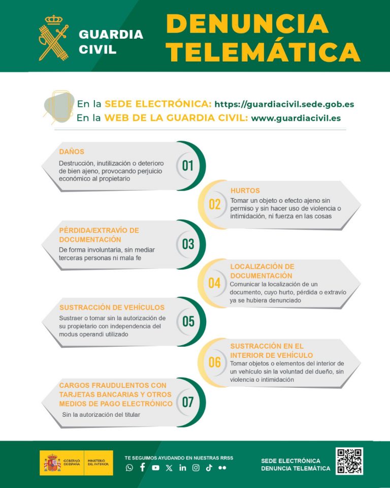 La Guardia Civil ha lanzado una campaña informativa para dar a conocer este servicio, recordando que la denuncia telemática supone una alternativa cómoda y accesible para los ciudadanos, especialmente en situaciones donde no existe un riesgo inminente ni se requiere atención de urgencia. Además, incluye un código QR que enlaza directamente con el formulario de denuncia, facilitando el acceso desde dispositivos móviles.