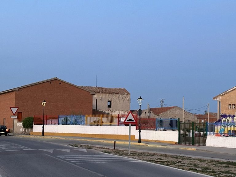 Desde la carretera de Villamanrique miramos al patio del Colegio y a las instalaciones del Cine y la antigua Fábrica de Harinas