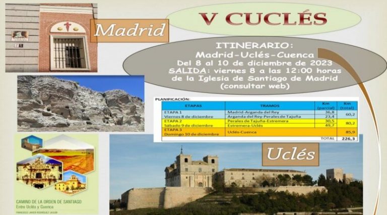 La V edición de la CUCLÉS, originalmente programada para el 20 de octubre y postergada debido a las inclemencias del clima, ha sido reprogramada para llevarse a cabo del 8 al 10 de diciembre. Durante esta travesía, se explorará el Camino de la Orden de Santiago, conectando Madrid, Uclés y Cuenca.