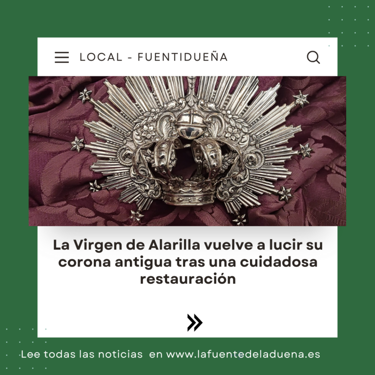 La imagen de Nuestra Señora de Alarilla vuelve a brillar con todo su esplendor, gracias a la restauración de su antigua corona, que había sufrido desperfectos a lo largo de los años debido al paso del tiempo según ha informado la Hermandad. El delicado trabajo de restauración ha sido realizado y donado generosamente por Joyería Gallego.