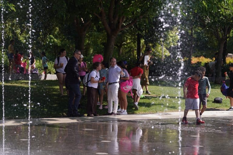 La ‘playa’ urbana de Madrid Río y las pérgolas nebulizadoras de los parques de La Gavia y plaza de España han entrado en funcionamiento para el disfrute de vecinos y visitantes. El encendido se ha producido al mediodía en presencia del delegado de Urbanismo, Medio Ambiente y Movilidad, Borja Carabante, quien ha visitado el icónico parque que soterró la M-30. Los populares ‘chorros’ funcionarán durante el periodo estival de 11:00 a 21:00 horas.