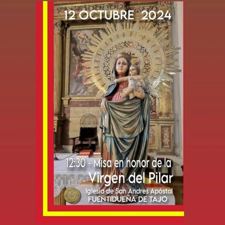 La Hermandad de la Virgen de Alarilla de Fuentidueña de Tajo ha informado que, con motivo de la Festividad de la Virgen del Pilar, patrona de la Guardia Civil, se celebrará una misa el próximo sábado 12 de octubre a las 12:30 horas en la Iglesia Parroquial de San Andrés Apóstol.