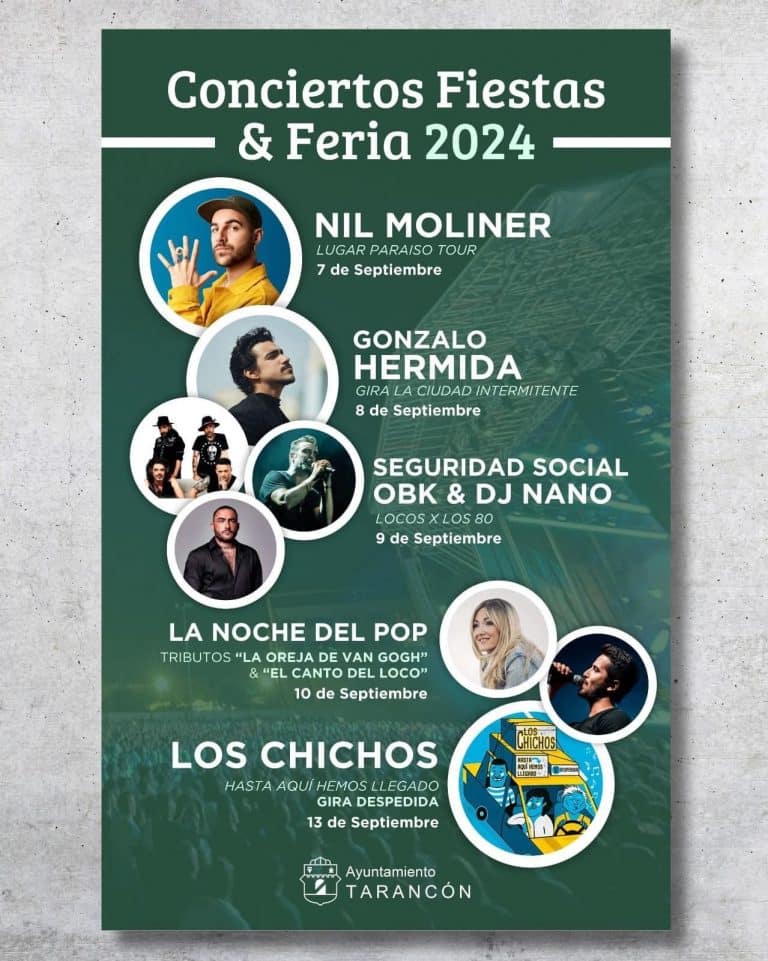 La programación arrancará este año el 7 de septiembre con Nil Moliner, un músico y compositor muy actual, que actuará por primera vez en la provincia de Cuenca con esta actuación en Tarancón. El día 8 de septiembre, Día Grande, habrá un concierto de Gonzalo Hermida, conocido por interpretar la banda sonora de la serie La Promesa. El día 9 estarán en Tarancón los grupos de los ochenta: OBK, Seguridad Social y también DJ Nano.