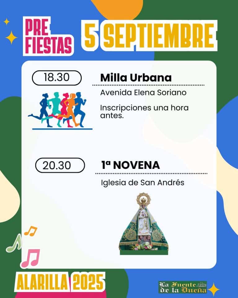 Programación 5 septiembre PreFiestas Alarilla 2025 La Milla Urbana y el comienzo del novenario marcan los actos de este viernes Prefiestas en Fuentidueña. Vistas 622
