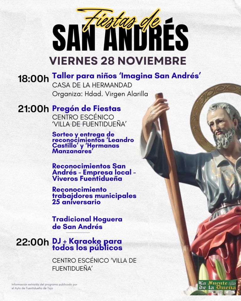 Programación Fiestas de San Andrés 28 de noviembre Comienzan las fiestas de San Andrés este viernes con los reconocimientos, pregón y primera noche de música. Vistas 272