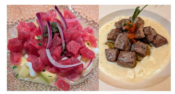 - Tarantelo de Atún rojo con su ceviche de calamar, mango y esferas de codium – 25,00 €