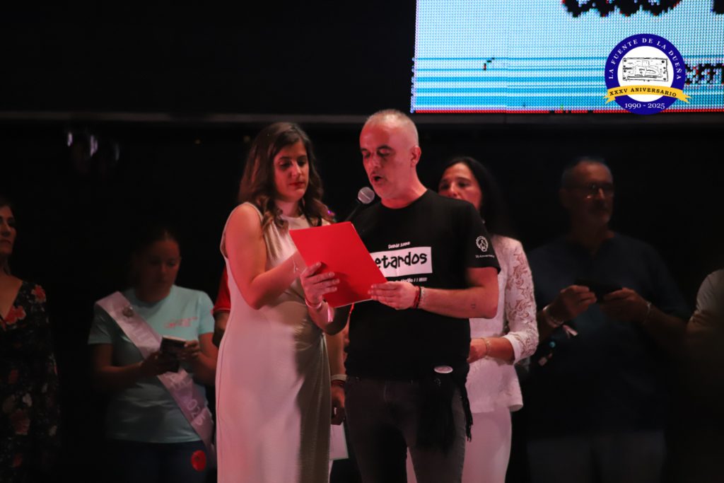 Luis Muñoz, con sus 82 años y una vida dedicada a colaborar en las fiestas desde la comisión de festejos, se mostró orgulloso de ser pregonero y de haber acompañado durante décadas la devoción a la Virgen de Alarilla. “Con 82 años sigo colaborando para que todos pudieran disfrutar al máximo”, dijo, recordando su implicación constante a pesar de haber vivido fuera del municipio. “Aunque he pasado media vida fuera de Fuentidueña, siempre he llevado la bandera española en mi pueblo y en mis pensamientos”, recalcó. En su mensaje, puso en valor la unión de los vecinos: “No somos varias familias, sino una sola, con el mismo corazón y los mismos sentimientos.”